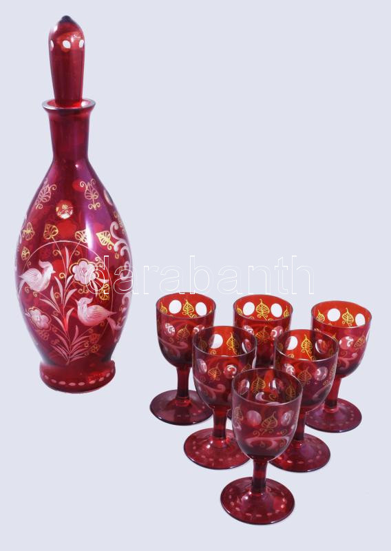Leírás: cca 1800 Bíborpácolt italos készlet 6 pohárral, minimális kopással, m: 8,5-27 cm