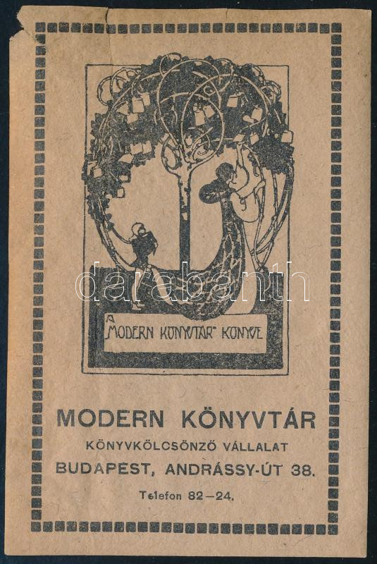 Sarkadi Emil (1881-1908): A Modern Könyvtár könyve (szecessziós ex libris). Klisényomat, papír, jelzés nélkül, bal felső sarkában kissé sérült, 9,5x6 cm.
