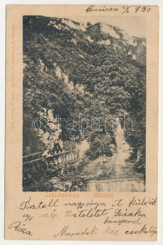 Leírás: 1900 Szászkabánya, Németszászka, Sasca Montana; Malomvölgy, vízimalom. C. Kehrer kiadása / Mühlthal / valley, watermill + "ORAVICZA - JASSENOVA 210. SZ." vasúti mozgóposta bélyegző (b)