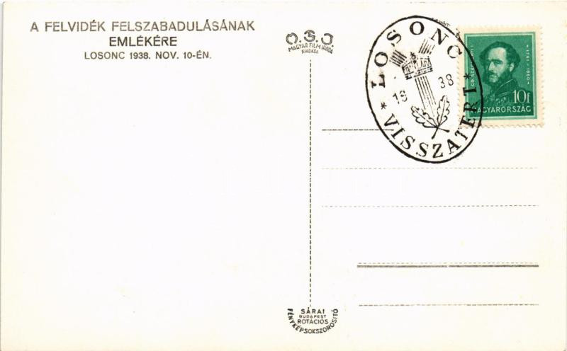 1938 Losonc, Lucenec; bevonulás / entry of the Hungarian troops + "1938 Losonc visszatért" So. Stpl.