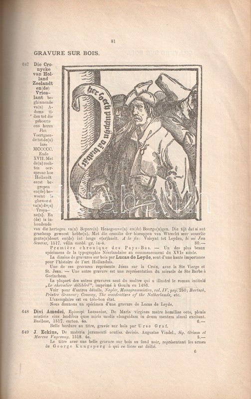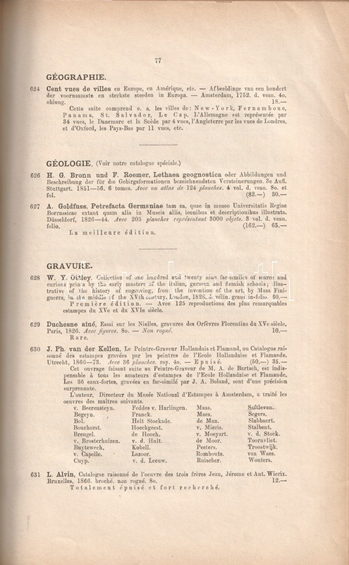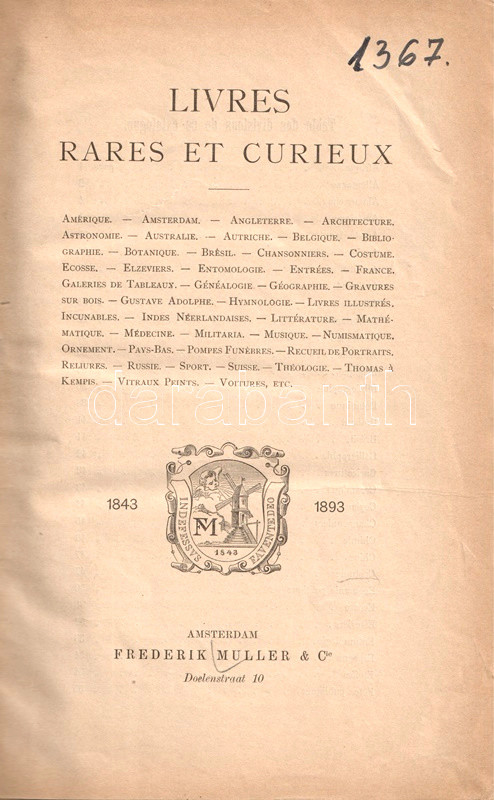 Francia nyelvű antikvár árverési katalógusunk egy 1893. évi amszterdami könyvárverésnek állít emléket. Katalógusunk 1637 tétele téma szerinti csoportosításban szerepel: hollandiai árverésünk a világ minden részén kiadott könyvek seregszemléje volt. Oldalszámozáson belül néhány szövegközti illusztrációval.