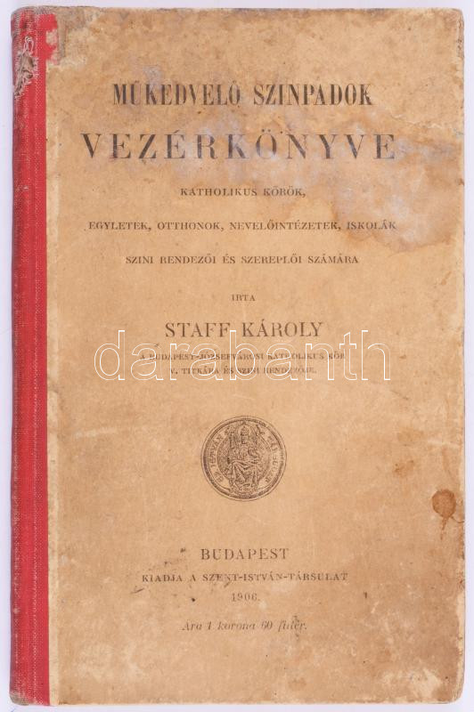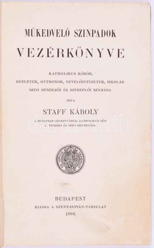 Staff Károly: Műkedvelő szinpadok vezérkönyve katholikus körök, egyletek, otthonok, nevelőintézetek, iskolák szini rendezői és szereplői számára. Bp., 1906, Szent István-Társulat, 104 p. Egyetlen kiadás. Kiadói félvászon-kötés, viseltes, foltos borítóval, a gerincen kisebb sérüléssel, helyenként kissé foltos lapokkal. Ritka!