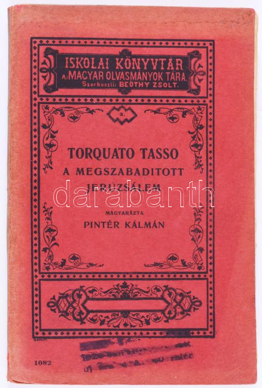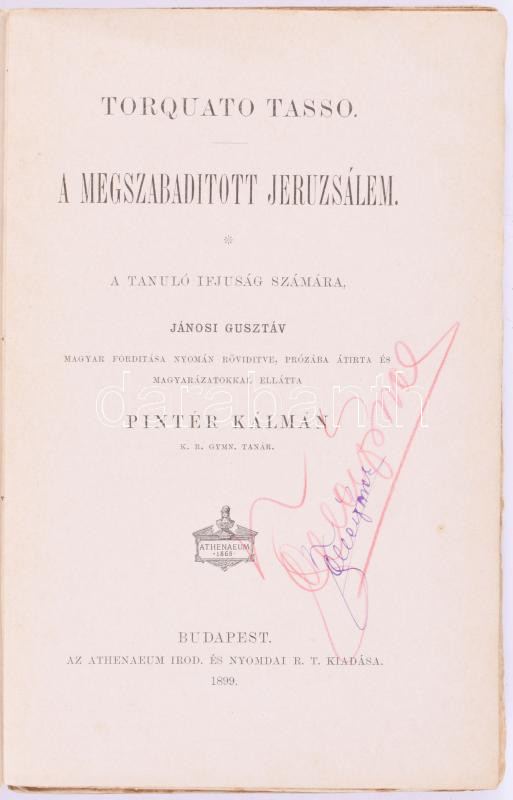 Torquato Tasso: A megszabadított Jeruzsálem. A tanuló ifjuság számára, Jánosi Gusztáv magyar fordítása nyomán rövidítve, prózába átírta és magyarázatokkal ellátta Pintér Kálmán k. r. gymn. tanár. Bp., 1899, Athenaeum, 1 t.+VII+1+178 p. Kiadói papírkötés, szakadt, foltos borítóval, az elején kissé sérült fűzéssel.