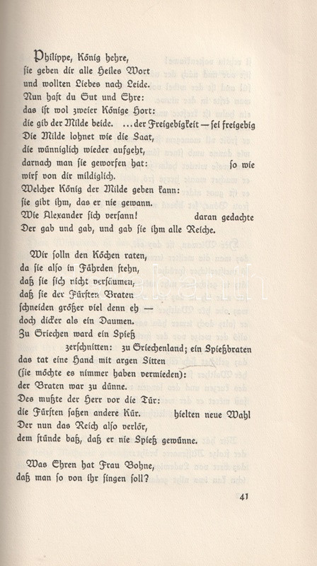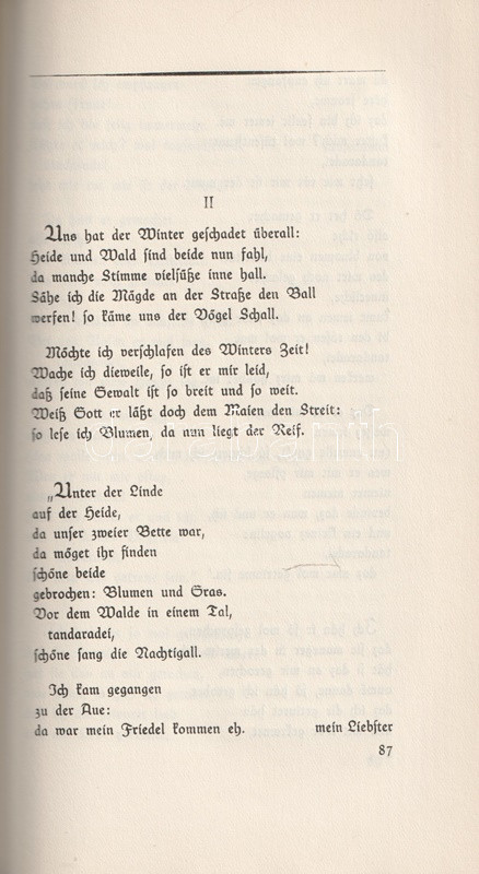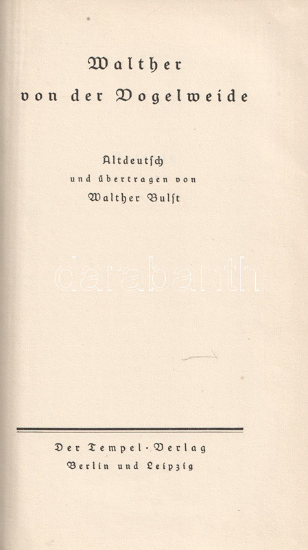 Walther von der Vogelweide (1170-1230) délnémet területeken működő ónémet költő, minnesänger, a középkori világi német líra kiemelkedő egyénisége. Ónémet költeményeit Walther Bulst (1899-1986) irodalomtörténész, középkorász fordította modern nyelvre, bibliofil kötetünk a berlini Tempel Verlag sorozatában jelent meg.