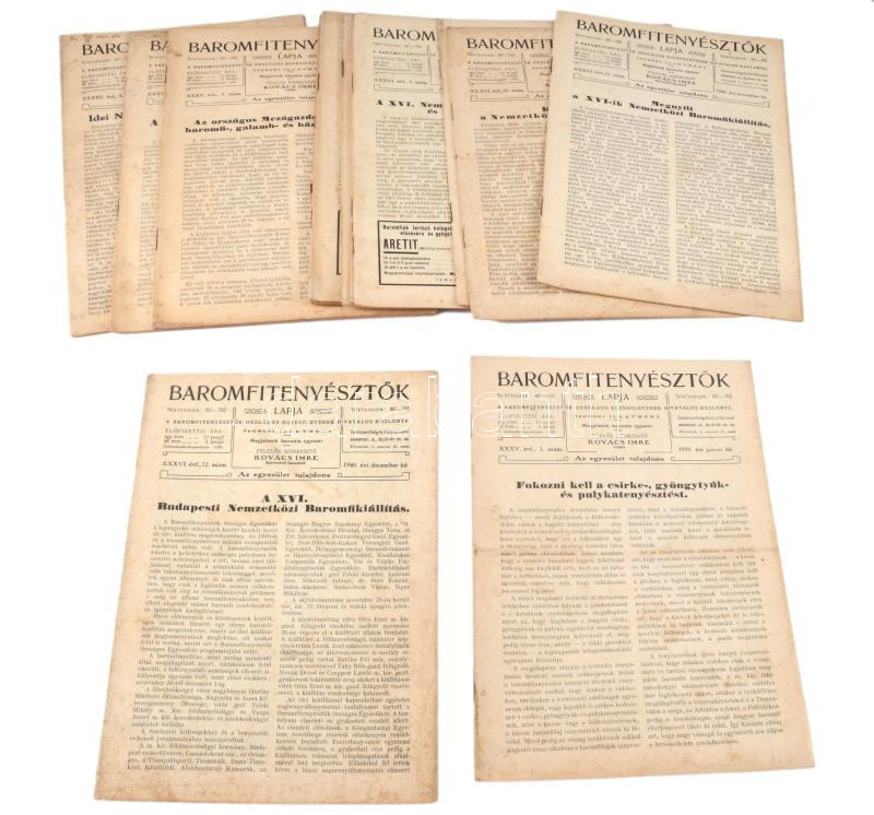 1937-1940 Baromfitenyésztők Lapja XXXIII., XXXV., XXXVI. évfolyamok összesen 13 db szórványszáma, szerk.: Kovács Imre. Kiadói tűzött papírkötés, változó állapotban, részben foltos.