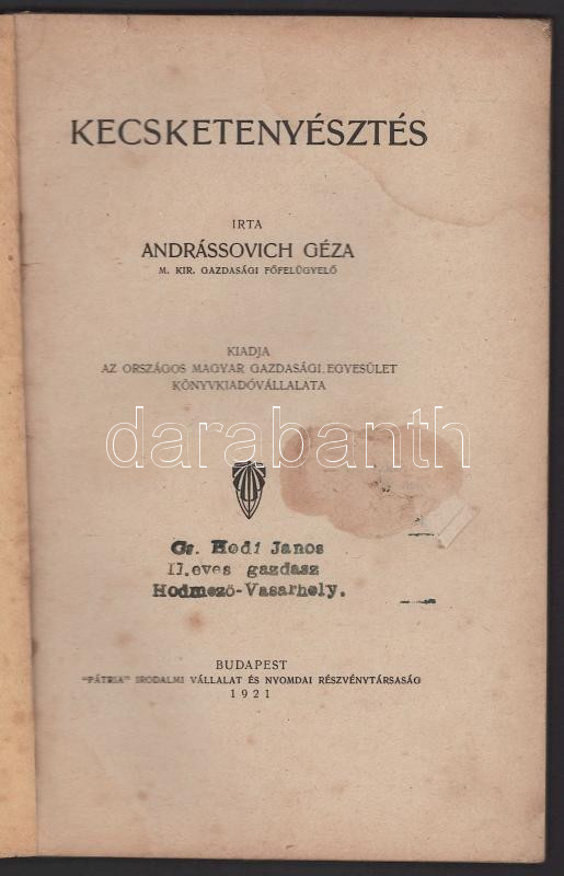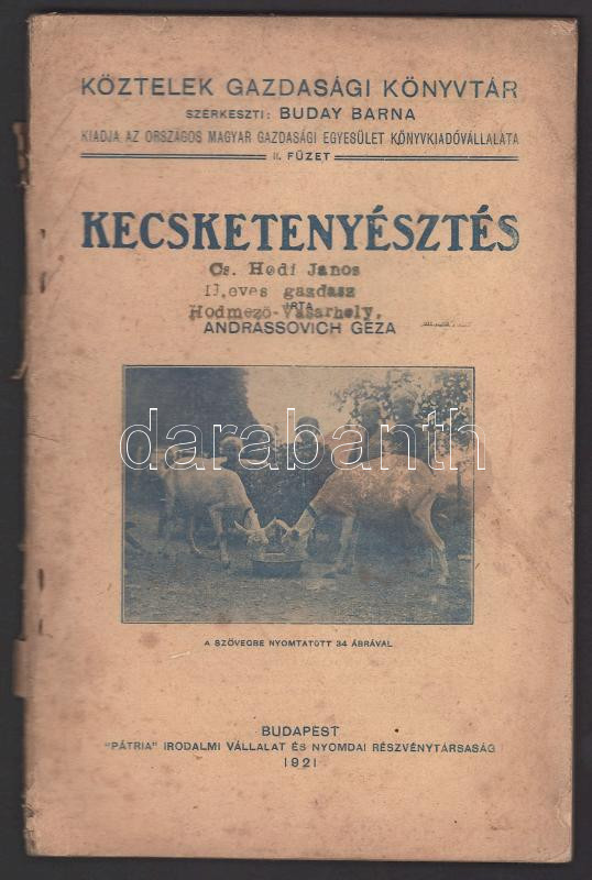 Andrássovich Géza: Kecsketenyésztés. Köztelek Gazdasági Könyvtár 2. füzet. Bp., 1921, Pátria, 107+[1] p. Első kiadás. Kiadói papírkötés, viseltes állapotban, sérült, foltos borítóval, néhány sérült lappal, ázásnyomokkal.