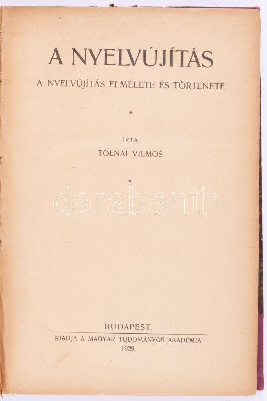 Tolnai Vilmos: A nyelvújítás. A nyelvújítás elmélete és története. Bp.... https://www.darabanth.com/hu/516-Filatelia-kepeslap-numizmatika-mutargy-konyv-papirregiseg-ekszer-aukcio/520.0/Konyvek/Konyvek-Tarsadalomtudomany~1097/Tolnai-Vilmos-A-nyelvujitas-A-nyelvujitas-elmelete-es-tortenete-Bp-1929-Magyar-Tudomanyos~II3503197
