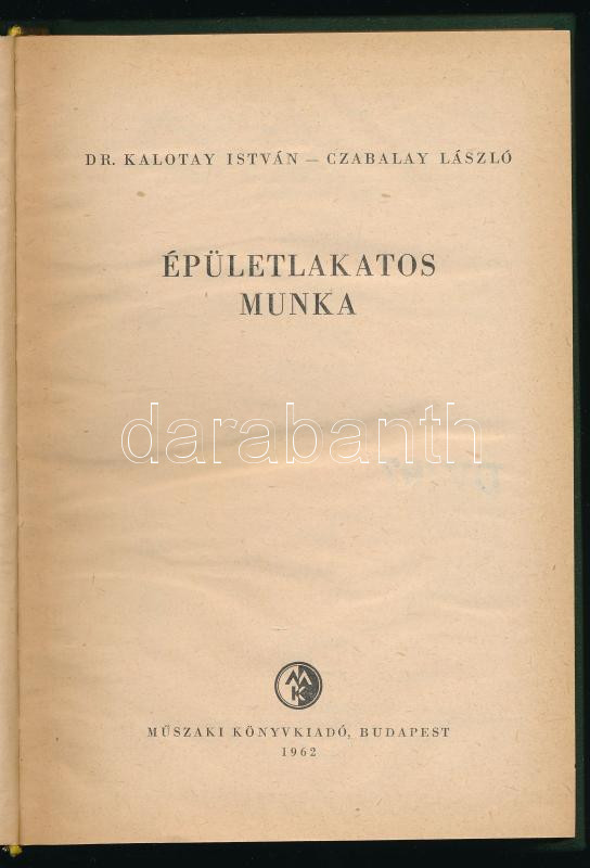 Kalotay István - Czabalay László: Épületlakatos munka. Ipari szakkönyvtár. Bp., 1962, Műszaki Könyvkiadó, 395+[1] p. Egészvászon-kötésben, intézményi bélyegzőkkel.