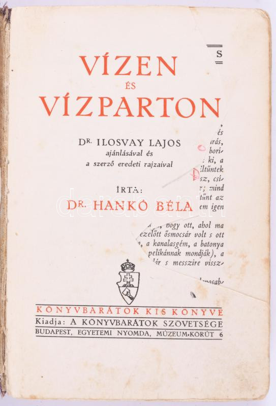 Leírás: Hankó Béla: Vízen és vízparton. Könyvbarátok Kis Könyve. Bp.,[1933],Kir. M. Egyetemi nyomda, 143 p. Szövegközti fekete-fehér illusztrációkkal. Kiadói félvászon-köté, kopott, foltos borítóval, laza fűzéssel, kijáró elülső szennylappal és előzéklappal, sérült, hiányos címlappal, foltos lapokkal.