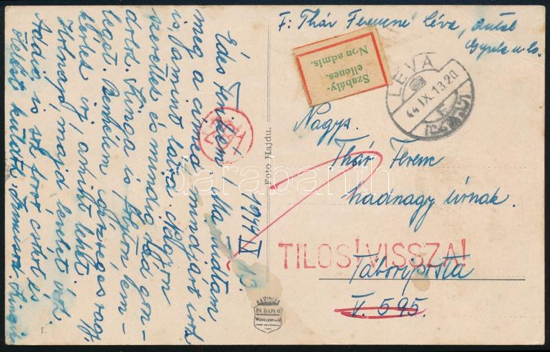 1944 Képeslap Léváról tábori postára címezve, "Szabályellenes" címkével és "TILOS! VISSZA!" bélyegzéssel visszaküldve
