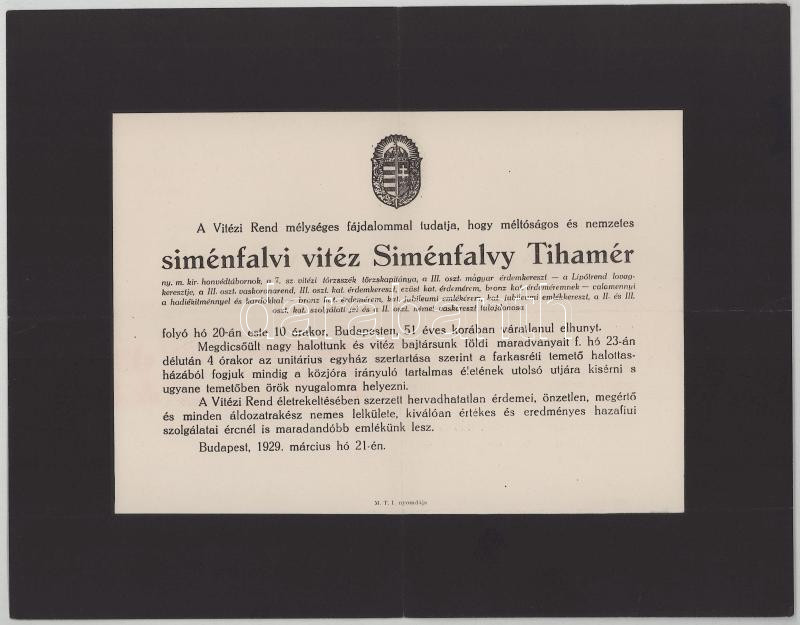 1929 Bp., siménfalvi vitéz Siménfalvy Tihamér (1878-1929) honvédtábornok, a 7. sz. vitézi törzsszék törzskapitánya, korábban a Székely Hadosztály vezérkari főnöke, a Lipót-rend, a III. oszt. Vaskorona-rend és további kitüntetések tulajdonosa halotti értesítője, 23x30 cm