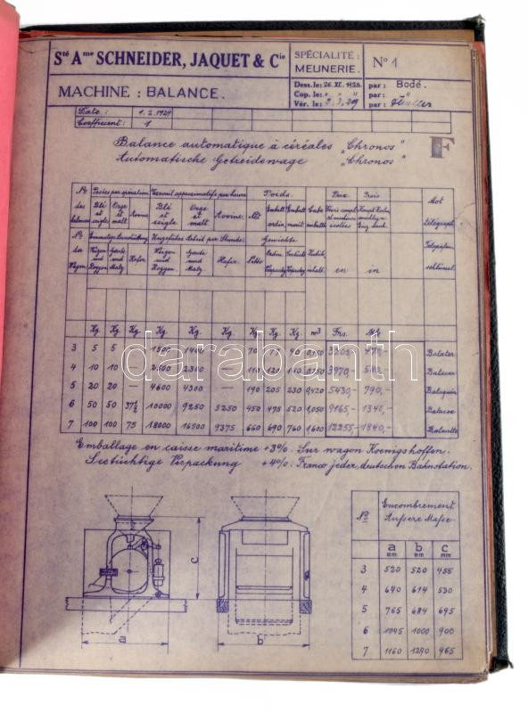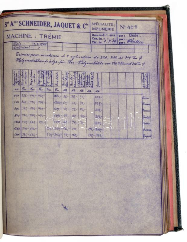 ca 1930 Schneider Jacquet & Cie. által gyártott gabonaipari, malomipari berendezések műszaki adtait tartalmazó gépkönyv. Kb 90 oldalon, 90 gép leírása Egészvászon kötésben