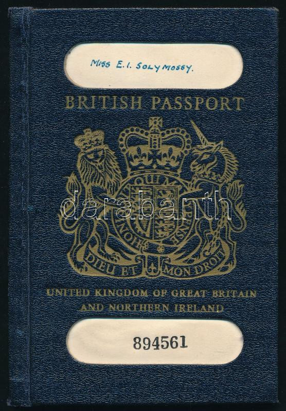 Leírás: 1963 London, Brit Királyság által kiállított fényképes útlevél Solymossy Erzsébet számára / British passport