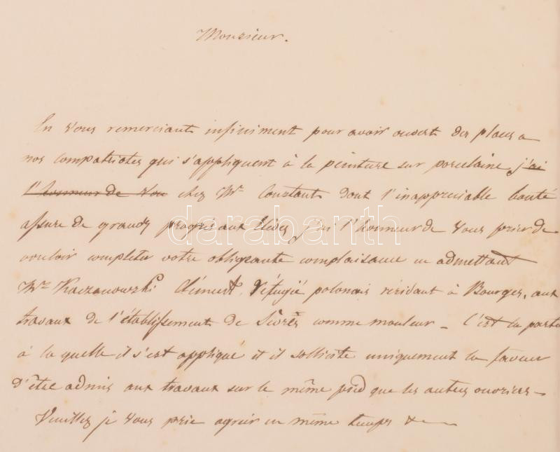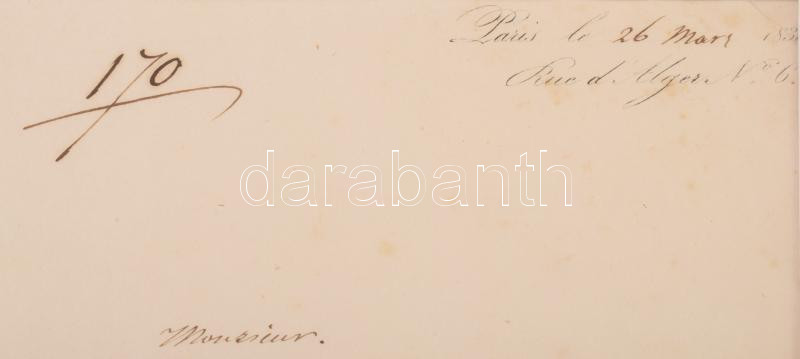 1835 József Bem / Jozef Zachariasz Bem (1794-1850) a Hungarian army lieutenant general of Polish origin, later an Ottoman pasha, "the father of the Bem of the Székelys". A one and a half page autograph letter in French from 1835 as director of the Société Polytechnique Poloniae, on the company's letterhead. Bem founded the institute as one of the leaders of the Polish emigration after the suppression of the Polish Revolution. During his emigration to Paris, he published several books, many under a pseudonym. The best known is: On the National Uprising in Poland. In this letter, he expresses his dissatisfaction with his publisher and his concerns regarding the book.