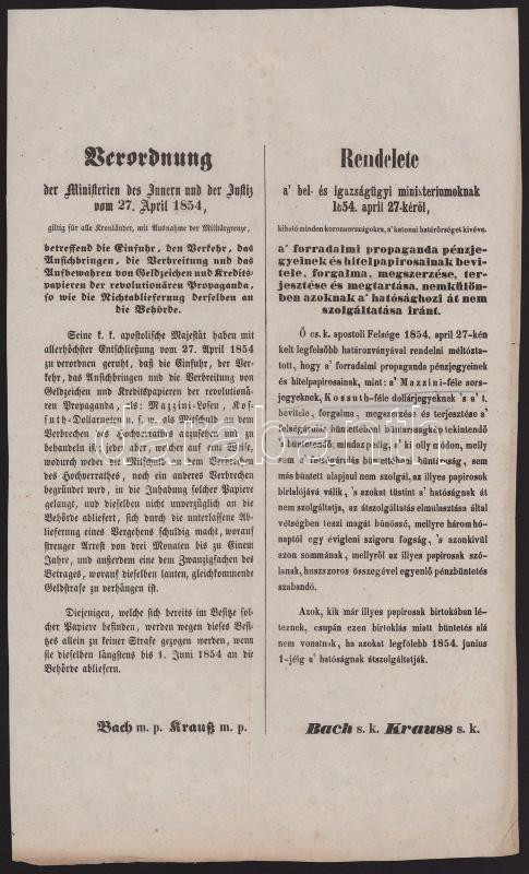 1854 Kossuth bankók és egyéb szabadságharci pénzjegyek birtoklásáért való büntetésről szóló rendelet Bach belügyminisztertől magyar- és német nyelvű hirdetmény.