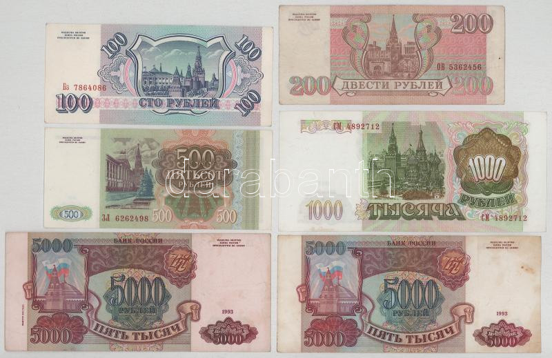 Russia 1993. 100 Roubles + 200 Roubles + 500 Roubles + 1000 Roubles + 5000 Roubles (2x) C:VF-F