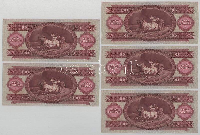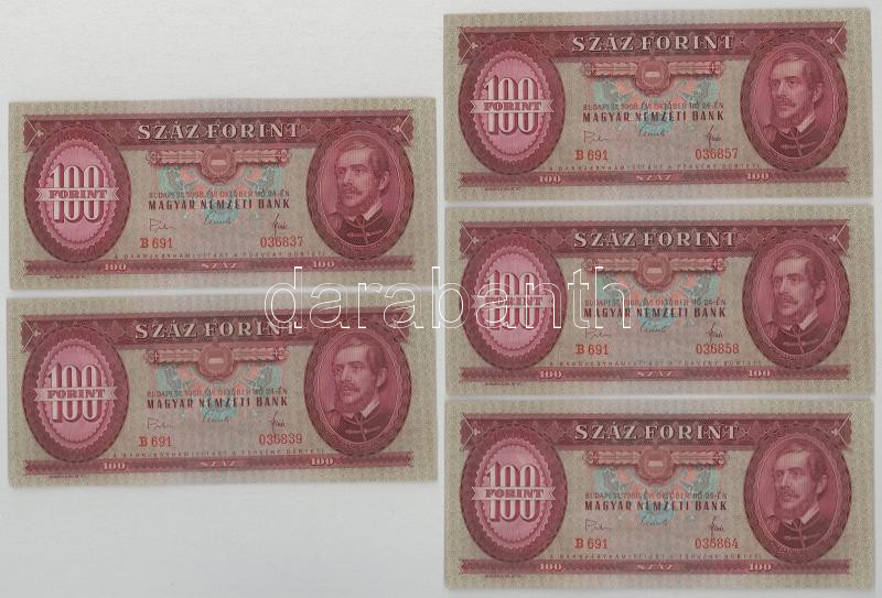 1968. 100Ft (5x) sorszámkövető pár és közeli sorszámok "B 691" T:AU hu... https://www.darabanth.com/hu/516-Filatelia-kepeslap-numizmatika-mutargy-konyv-papirregiseg-ekszer-aukcio/520.0/Numizmatika/Magyar-bankjegyek~1011/1968-100Ft-5x-sorszamkoveto-par-es-kozeli-sorszamok-B-691-T-AU-hullamos-papirAdamo-F32~II3501550