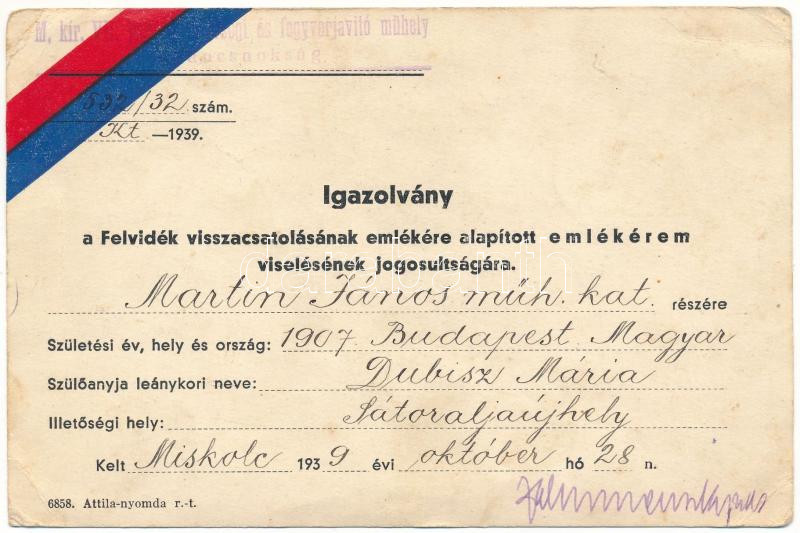 Hungary 1939. Bearer's ID for the "Upper Hungary Medal" decoration, with stamp from the "7th Hungarian Royal Honvéd Artillery and Weapon repair workroom" T:XF corner folds