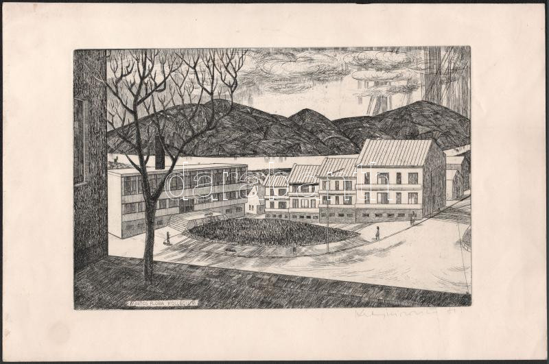 Leírás: Krajcsirovits Henrik (1929-2007): Martos Flóra Kollégium. Rézkarc, papír, jelzett, 19,5×29,5 cm