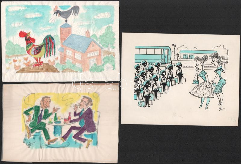 Leírás: Szegő Gizi (1902-1985): 3 db karikatúra. Tus, papír, jelzett, mindegyik hátoldalán "Ludas Matyi Szerkesztősége" vagy Kis Ludas bélyegzővel. 16x21 cm körüli méretekben