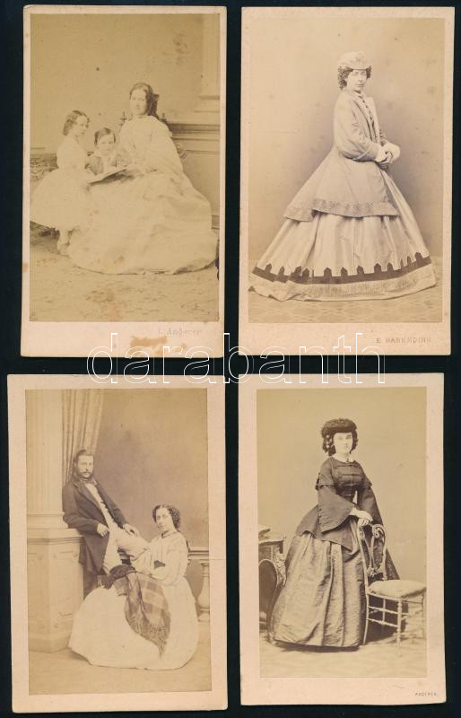 Leírás: cca 1860-1870 Előkelő hölgyeket, urat, gyerekeket ábrázoló vizitkártyák, 4 db, különféle bécsi műtermekből (Ludwig Angerer, Emil Rabending, Amand Schlossarek), 10,5x6,5 cm körül