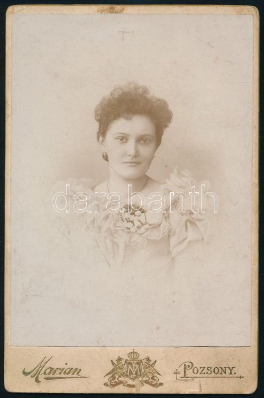 cca 1900 Elegáns fiatal hölgy portréja, kabinetfotó a pozsonyi Marian ... https://www.darabanth.com/hu/517-Filatelia-kepeslap-numizmatika-mutargy-konyv-papirregiseg-ekszer-aukcio/522.0/Fotomuveszet/Foto~62/cca-1900-Elegans-fiatal-holgy-portreja-kabinetfoto-a-pozsonyi-Marian-muterembol-16-5x11-cm~II3507385