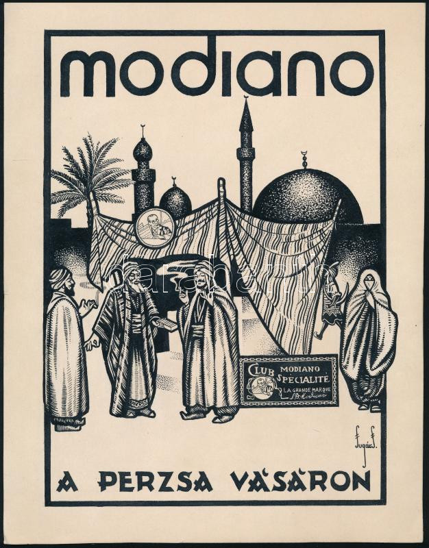 Sugár János (?-?, működött a XX. sz. első felében): "Modiano. A perzsa... https://www.darabanth.com/hu/517-Filatelia-kepeslap-numizmatika-mutargy-konyv-papirregiseg-ekszer-aukcio/522.0/Fotomuveszet/Reklam~64/Sugar-Janos-mukodott-a-XX-sz-elso-feleben-Modiano-A-perzsa-vasaron-reklam-terv-~II3509352