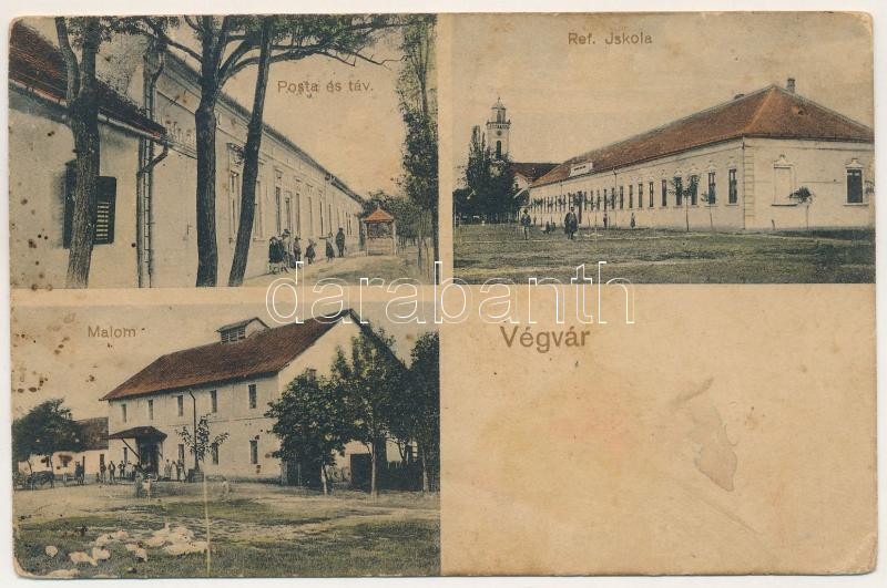 Leírás: 1914 Végvár, Tormac; Posta és távirda, Református iskola, Malom. Fogyasztási szövetkezet kiadása / post and telegraph office, Calvinist school, mill (Rb)