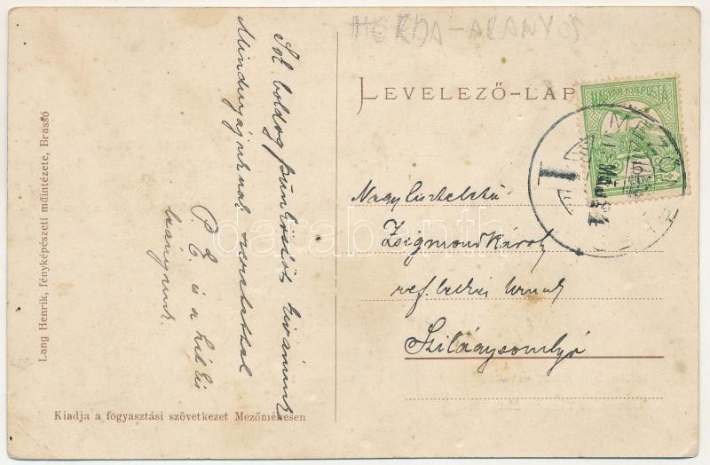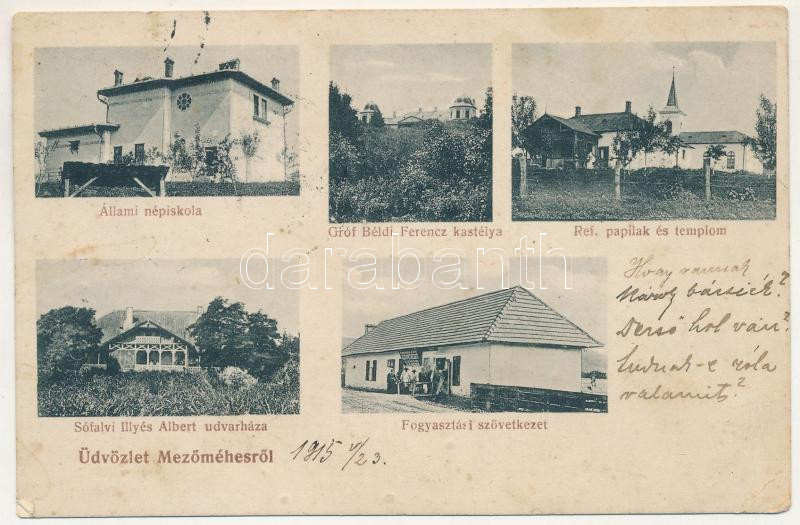 1915 Mezőméhes, Mihesu de Campie (Maros); Sófalvi Illyés Albert udvarháza, állami népiskola, gróf Béldi Ferenc kastélya, református paplak és templom, Fogyasztási szövetkezet üzlete és saját kiadása, Lang Henrik fényképészeti műintézete / villa, school, Calvinist vicarage and church, cooperative shop (tűnyomok / pinmarks)