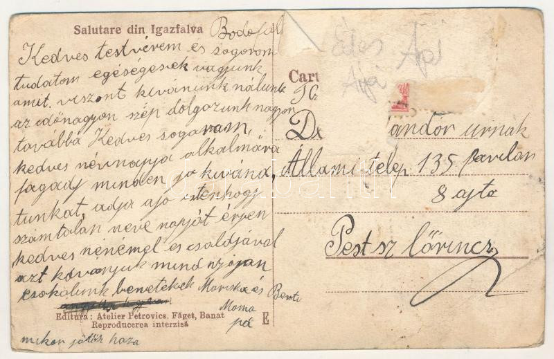 Leírás: Igazfalva, Dumbrava; Községháza, Stefan Löv és Emerich Marti üzlete. Petrovics fényképész kiadása / Casa comunala, Pravalia / town hall, shops (Rb)