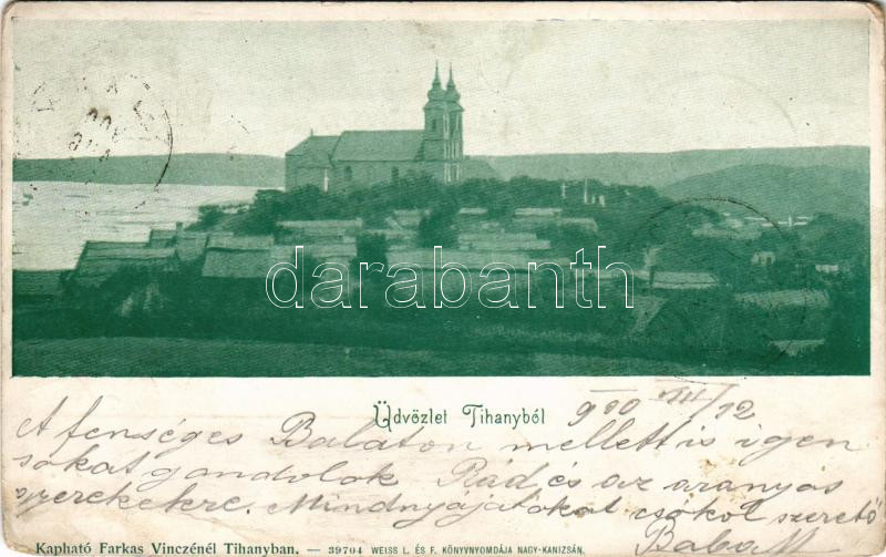 Leírás: 1900 Tihany, látkép. Kapható Farkas Vincénél, Weiss L. és F. könyvnyomdája (Rb)