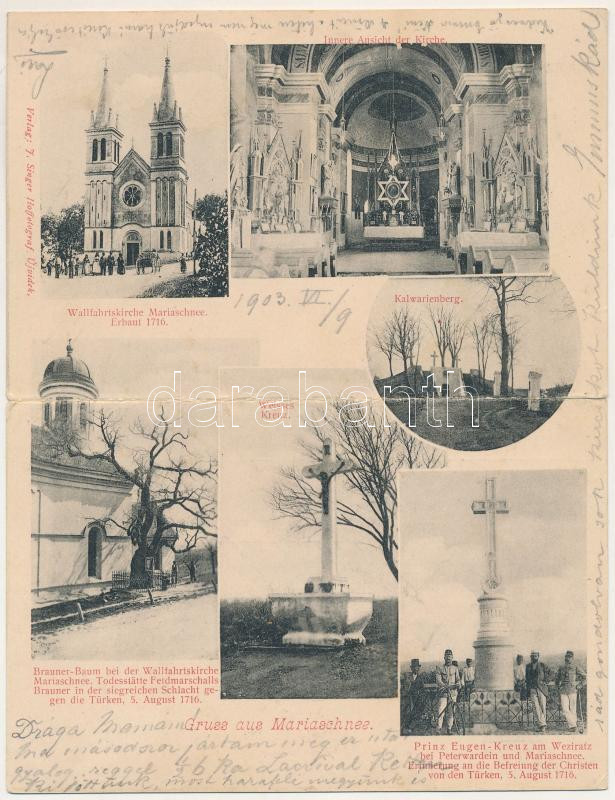 Leírás: 1903 Újvidék, Novi Sad; Mária kegytemplom, Kálvária hegy, Kereszt. 2-részes kihajtható lap. J. Singer kiadása / Wallfahrtskirche Mariaschnee, Kalwarienberg, Kreuz, Brauner-Baum, Prinz Eugen-Kreuz / church, cross, Calvary hill. 2-tiled folding card (szakadás / tear)
