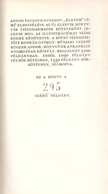 Könyvgyűjtők számára készült, számozott, bibliofil kiadás. Kolofon: "Anton Pavlovics Csehov: "Életem" című elbeszélése az Új Elzevir könyvtár tizenharmadik köteteként jelenik meg. Az illusztrációkat Szász Endre készítette. A kötet szerkesztője Konrád György. Műszaki vezető Kugler Andor. Megjelent 5200 példányban, ebből 1050 példány félbőr kötésben, 1550 bőrkötésben, számozva. Ez a könyv a 295. számú példány."