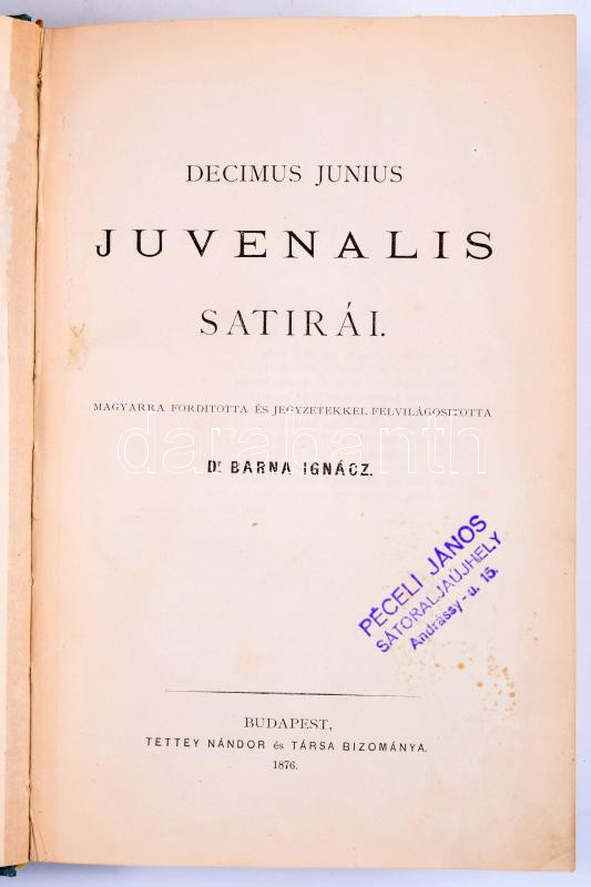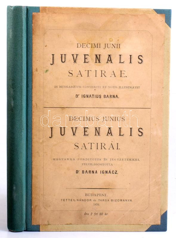 Decimus Junius Juvenalis Satirái. Magyarra fordította és jegyzetekkel felvilágosította: Dr. Barna Ignácz. Decimi Junii Juvenalis Satirae. In Hungaricum Convertit et Notius Illustravit Dr. Ignatius Barna. Bp., 1876, Tettey Nándor, (Weiszmann Testvérek-ny.),237+3 p. Kétnyelvű: latin és magyar nyelven. Átkötött félvászon-kötés, foltos címlappal, névbélyegzésekkel, egy javított lappal (9/10.)