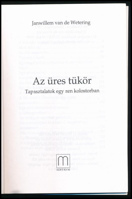 Leírás: Janwillem van de Wetering: Az üres tükör. Tapasztalatok egy zen kolostorban. Ford.: Farkas Tünde. Szentendre, 1999, Editio M. Kiadói papírkötés, könyv elején 14 kijáró lappal.