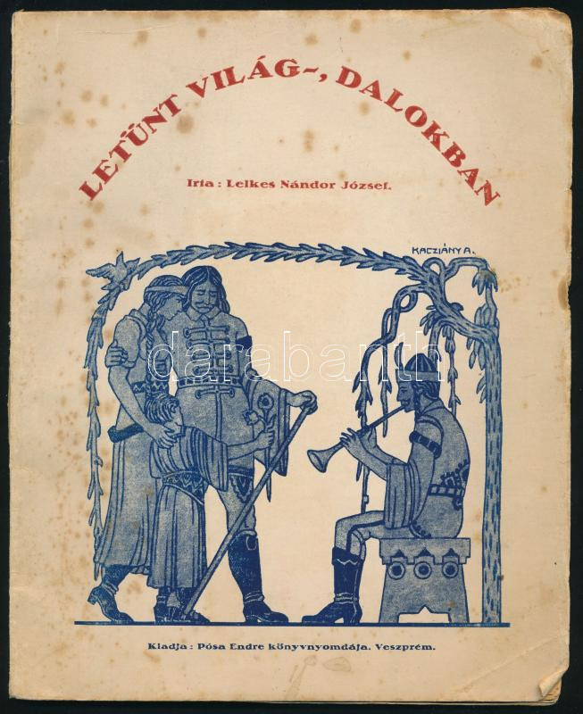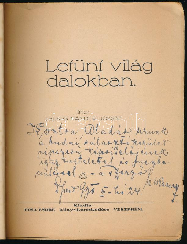 Lelkes Nándor József: Letűnt világ dalokban. A szerző által Kontra Aladár országgyűlési képviselő részére dedikált példány: ,,Kontra Aladár urnak, a budai választó kerület népszerű képviselőjének igaz tisztelettel és megbecsüléssel - a szerző". Veszprém, [1930], Pósa Endre, 62+[2] p. A borító Kacziány Aladár munkája. Kiadói papírkötés, foltos borítóval, az utolsó lap sérült, a hátsó borító hiányzik.
