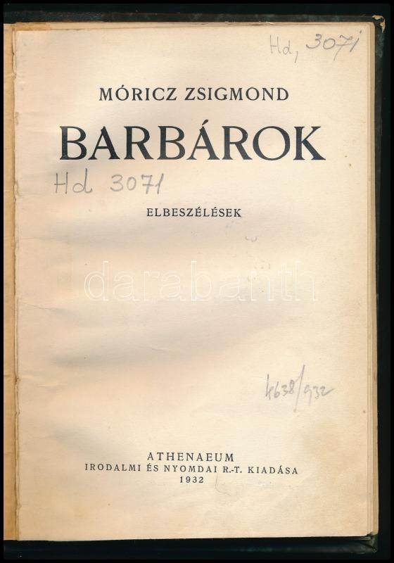 Móricz Zsigmond: Barbárok. Elbeszélések. Bp., 1932, Athenaeum, 94+[2] ... https://www.darabanth.com/hu/517-Filatelia-kepeslap-numizmatika-mutargy-konyv-papirregiseg-ekszer-aukcio/522.0/Konyvek/Konyvek-Egyeb-ritkasagok~157/Moricz-Zsigmond-Barbarok-Elbeszelesek-Bp-1932-Athenaeum-94plus2-p-Elso-kiadas-A-boriton~II3508085