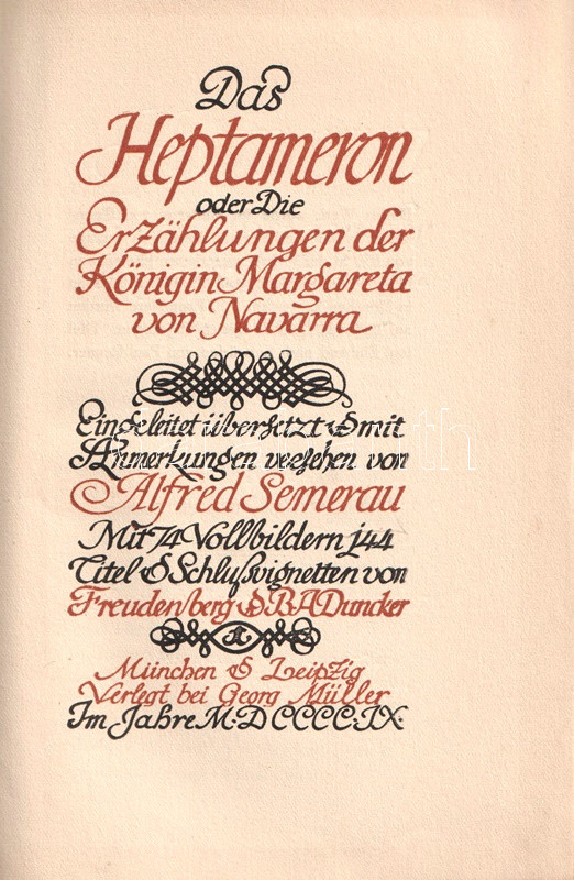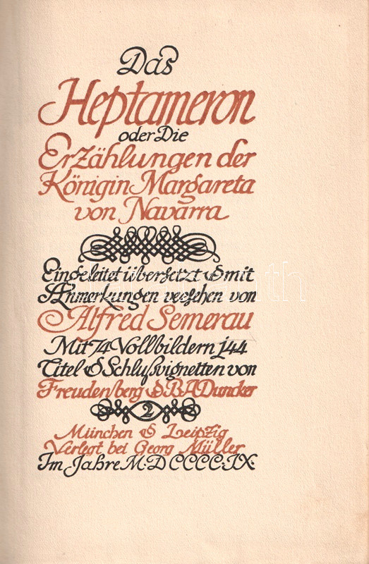 [Navarrai Margit] Margareta, Königin von Navarra: Das Heptameron, oder Die Erzählungen der Königin Margareta von Navarra. (Számozott.) Eingeleitet, übersetzt, & mit Anmerkungen versehen von Alfred Semerau. Mit 74 Vollbildern, 144 Titel & Schlussvignetten von Freudenberg & B. A. Duncker. Band I-II. [Teljes mű két kötetben.]