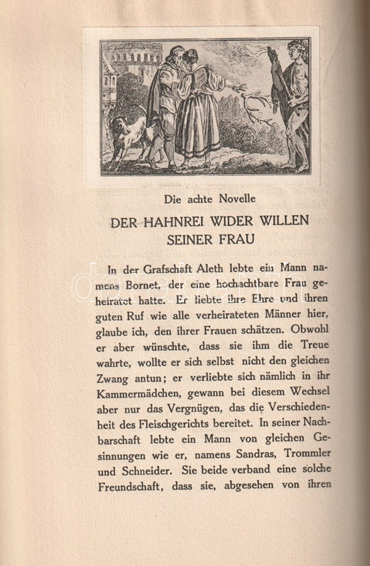 A XVI. századi francia koronás fő, Navarrai Margit reneszánsz életörömöt sugárzó, vérbő novellagyűjteményét a pornográf irodalom terjesztésével megvádolt, börtönbüntetéssel sújtott Alfred Semerau (1874-1958) müncheni irodalmár fordította le. Gazdagon illusztrált reneszánsz történetgyűjteményünk szövegét finoman erotikus metszetek kísérik. Kötetünk tipográfiáját és kötését Paul Renner német könyvművész tervezte.