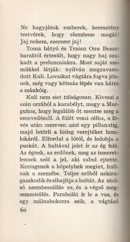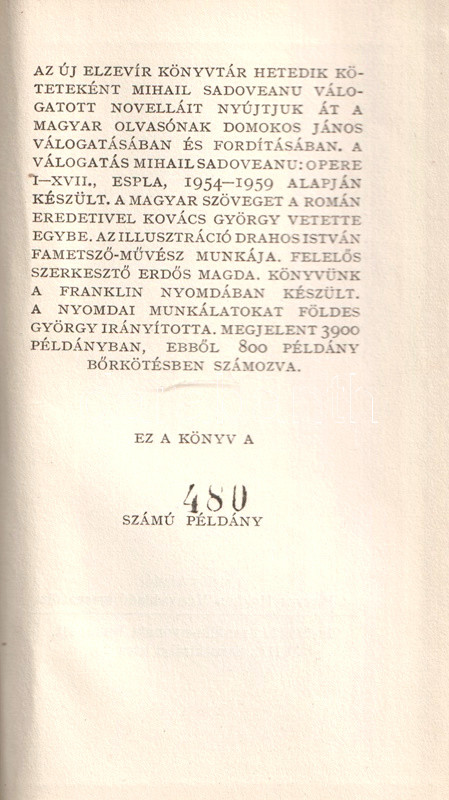 Könyvgyűjtők számára készült, számozott, bibliofil kiadás. Kolofon: "Az Új Elzevír könyvtár hetedik köteteként Mihail Sadoveanu válogatott novelláit nyújtjuk át a magyar olvasónak Domokos János válogatásában és fordításában. A válogatás Mihail Sadoveanu: Opere I-XVII., Espla, 1954-1959 alapján készült. A magyar szöveget a román eredetivel Kovács György vetette egybe. Az illusztráció Drahos István fametsző-művész munkája. Felelős szerkesztő Erdős Magda. A nyomdai munkálatokat Földes György irányította. Megjelent 3900 példányban, ebből 800 példány bőrkötésben, számozva. Ez a könyv a 480. számú példány".
