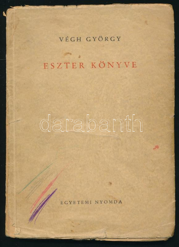 Leírás: Végh György: Eszter könyve. DEDIKÁLT! [Bp., 1946.], Egyetemi Nyomda, 46 p. Megjelent 500 példányban! Kiadói papírkötés, sérült borítóval, a borítón ceruzás firkával.