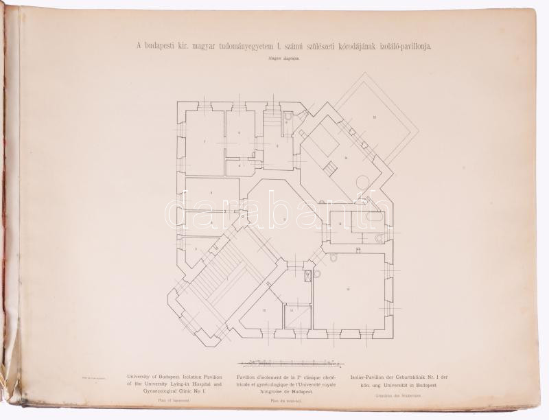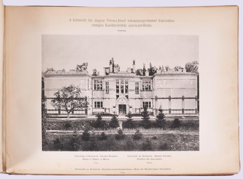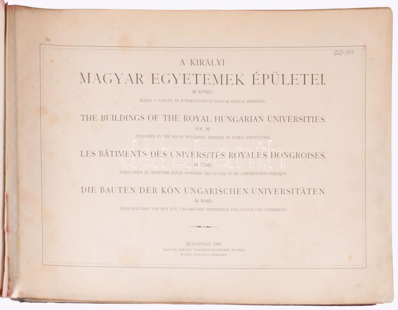 A királyi magyar egyetemek épületei. III. köt. Kiadja a vallás- és közoktatásügyi magyar királyi miniszter. Bp., 1908, Magyar Királyi Tudományegyetemi Nyomda, 160 sztl. lev. Egyetlen kiadás. Egészoldalas, fekete-fehér fotókkal és ábrákkal (homlokzatok, keresztmetszetek, alaprajzok). Magyar, angol, francia és német nyelven. Kiadói harántalakú, aranyozott egészbÅ‘r-kötés, megviselt, szétvált borÃtóval, ázásnyomokkal. Ritka!