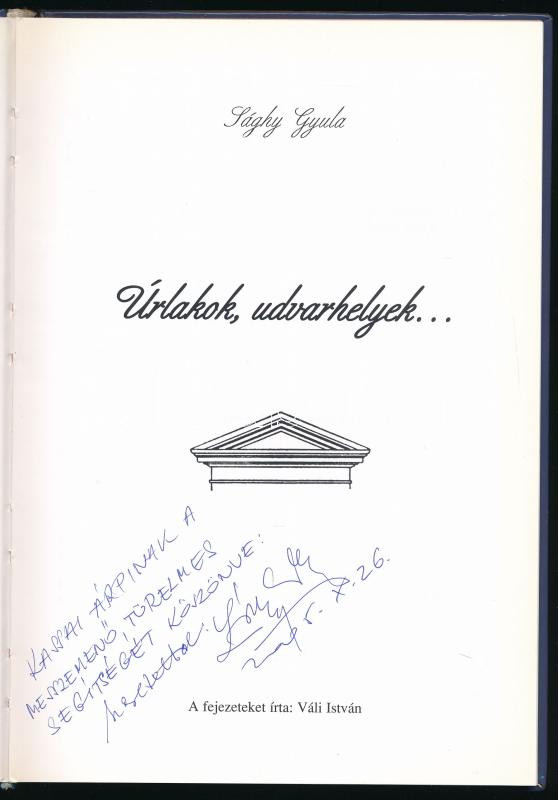 Sághy Gyula: Úrlakok, udvarhelyek... Számozott (581./600), szerző álta... https://www.darabanth.com/hu/517-Filatelia-kepeslap-numizmatika-mutargy-konyv-papirregiseg-ekszer-aukcio/522.0/Konyvek/Konyvek-Epiteszet-muveszet~143/Saghy-Gyula-Urlakok-udvarhelyek-Szamozott-581600-szerzo-altal-dedikalt-peldany-Hn-~II3509334