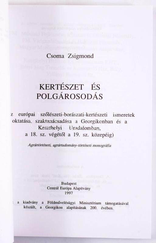 Kertészet és polgárosodás (Az európai szőlészeti-borászati-kertészeti ismeretek oktatása, szaktanácsadása a Georgikonban és a Keszthelyi Uradalomban, a 18. sz. végétől a 19. sz. közepéig). Szerk.: Csoma Zsigmond. Centrál Európa Alapítvány: Budapest, 1997. 366p. Kiadói papírkötésben, új állapot