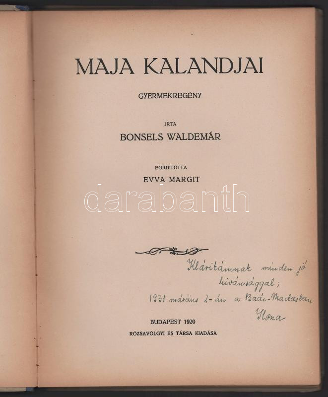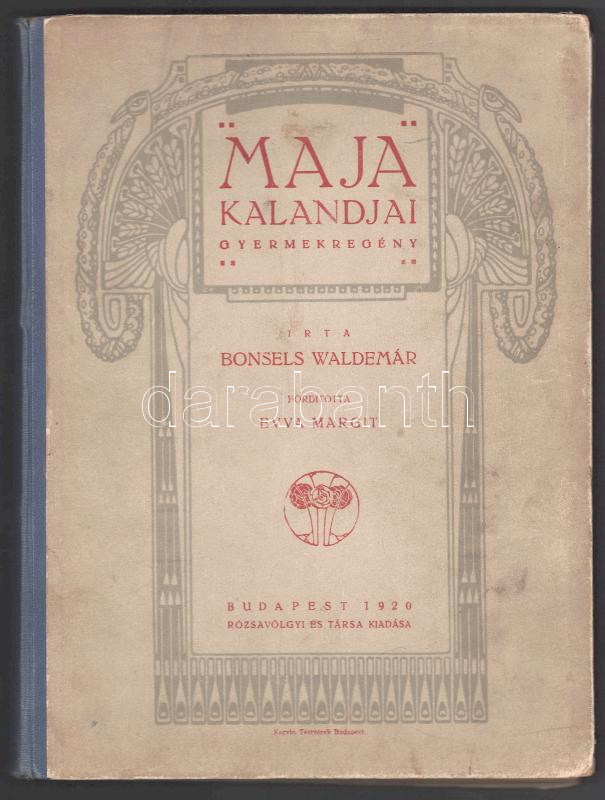 Bonsels Waldemár: Maja kalandjai. Gyermekregény. Budapest, 1920. [1919... https://www.darabanth.com/hu/517-Filatelia-kepeslap-numizmatika-mutargy-konyv-papirregiseg-ekszer-aukcio/522.0/Konyvek/Konyvek-Mesekonyvek-ifjusagi-irodalom~155/Bonsels-Waldemar-Maja-kalandjai-Gyermekregeny-Budapest-1920-1919-Rozsavolgyi-es-Tarsa~II3511597