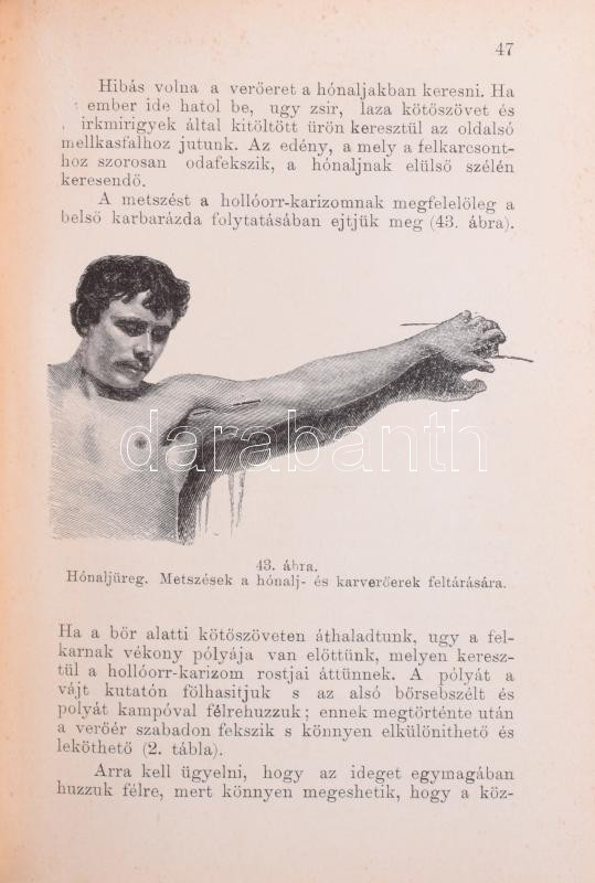 Zuckerkandl Ottó: A sebészeti műtéttan alapvonalai. Ford.: Dr. Illyés Géza. Orvosi kézi atlaszok VIII. Bp., [1899.], Singer és Wolfner, (Budapesti Hirlap-ny.),XVI+397+3 p. + 24 (színes kőnyomatú képtáblák) t. Gazdag fekete-fehér képanyaggal illusztrált. Kiadói egészvászon-kötés, festett felső lapélekkel, kopott borítóval, a gerincen címkével, foltos szennylapokkal, két lapot rossz helyre kötöttek be (IX/X, XIII/XIV p.)