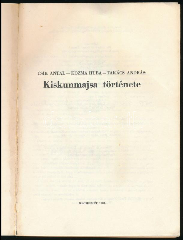 CsÃk Antal - Kozma Huba - Takács András: Kiskunmajsa története. Kiskunmajsa-Kecskemét, 1981, Kiskunmajsa Nagyközség Tanácsa - PetÅ‘fi Nyomda, 175+[1] p.+ XXXII (fekete-fehér fotók) t. Kiadói papÃrkötés, kissé viseltes borÃtóval. Megjelent 3000 példányban.