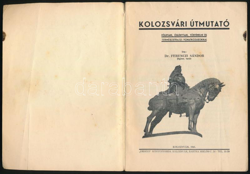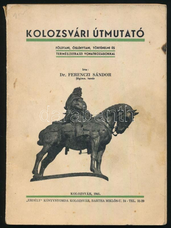 Ferenczi Sándor: Kolozsvári útmutató. Földtani, Å‘slénytani, történelmi és természetrajzi vonatkozásokkal. Kolozsvár, 1941, "Erdély"-ny., 158+[2] p. Kiadói papÃrkötés, kissé sérült gerinccel, helyenként kissé foltos, térkép-melléklet nélkül.