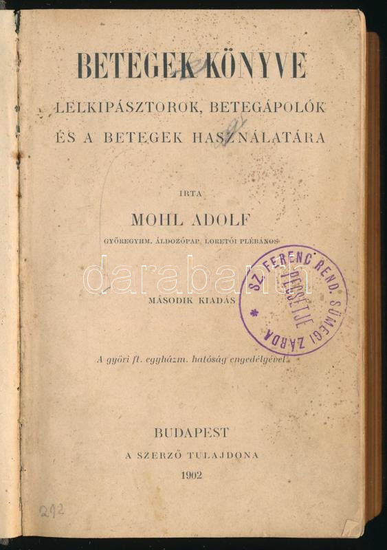 Mohl Adolf: Betegek könyve. Lelkipásztorok, betegápolok és a betegek h... https://www.darabanth.com/hu/517-Filatelia-kepeslap-numizmatika-mutargy-konyv-papirregiseg-ekszer-aukcio/522.0/Konyvek/Konyvek-Vallas~152/Mohl-Adolf-Betegek-konyve-Lelkipasztorok-betegapolok-es-a-betegek-hasznalata-Bp-1902-~II3507877