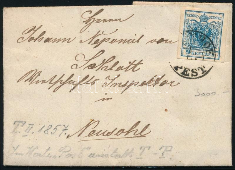 Leírás: 1857 9kr MP III. típ. levélen "BAHNHOF / PEST" - "NEUSOHL"